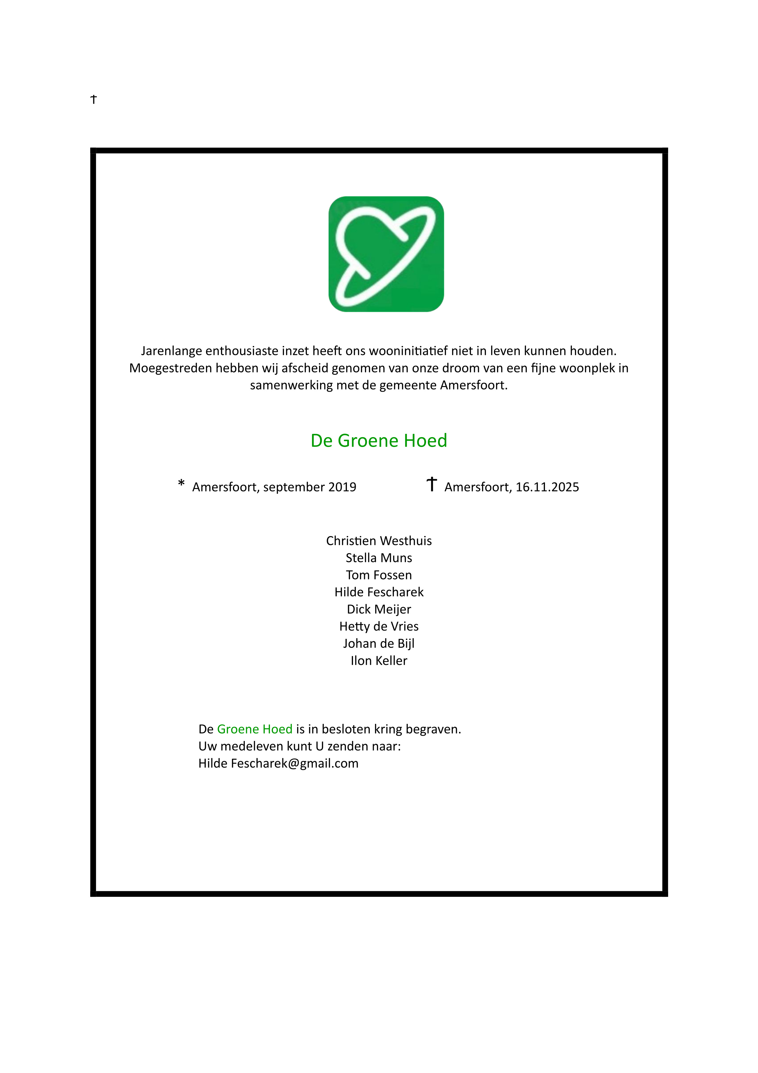 Het project 'Woongemeenschap De Groene Hoed' is per november 2025 gestopt. Het blijkt na jaren proberen te moeilijk voor de groep om het hieronder beschreven woonproject in Amersfoort te realiseren. Weinig medewerking van de burgerlijke gemeente, te weinig kapitaal om zelf veel te kunnen bekostigen en onze energie is tot een minimum gedaald. Binnenkort zal deze website dan ook verdwijnen.
